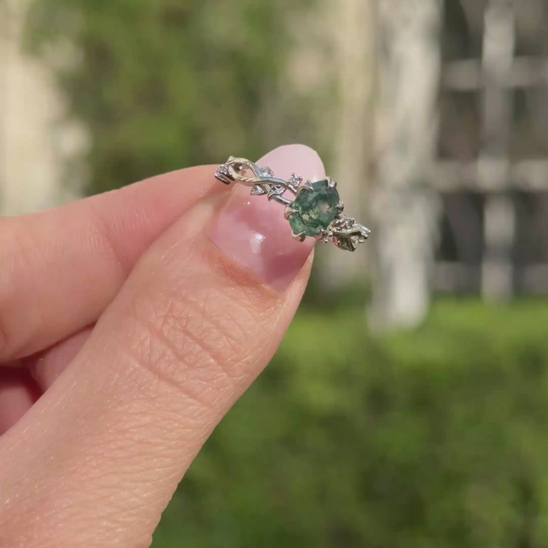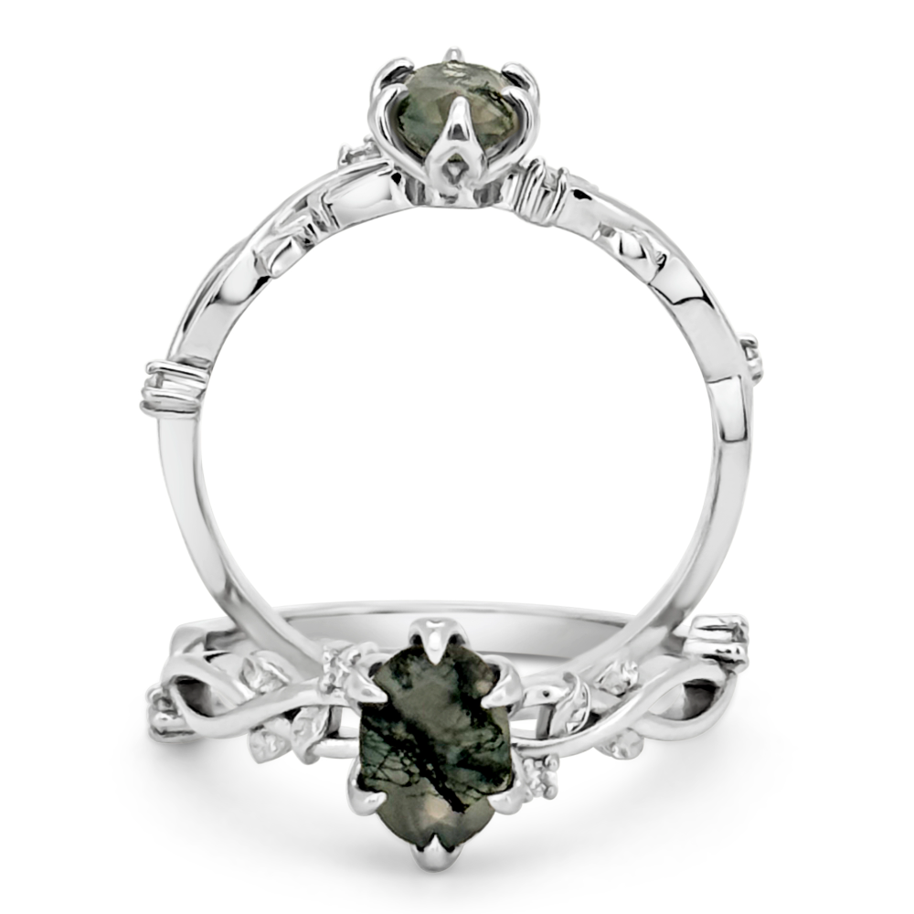 Este anillo no solo es una promesa, es una obra de arte natural. La ágata musgosa con sus vetas únicas representa la autenticidad de tu relación, mientras que las moissanitas elevan su belleza con un toque sofisticado.