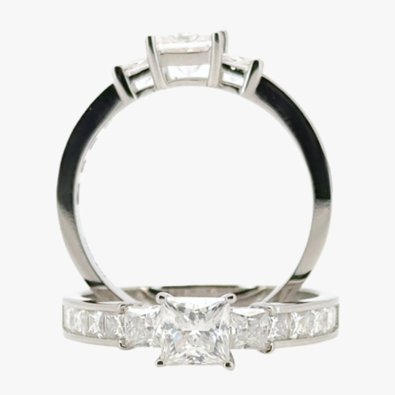 La piedra central se eleva en una corona de cuatro garras para permitir el paso de la luz desde múltiples ángulos, logrando un brillo nítido y elegante. A cada lado, dos piedras cuadradas complementan la composición con simetría, y un pavé de moissanitas cuidadosamente alineadas aporta destellos continuos sin perder la esencia minimalista del diseño.