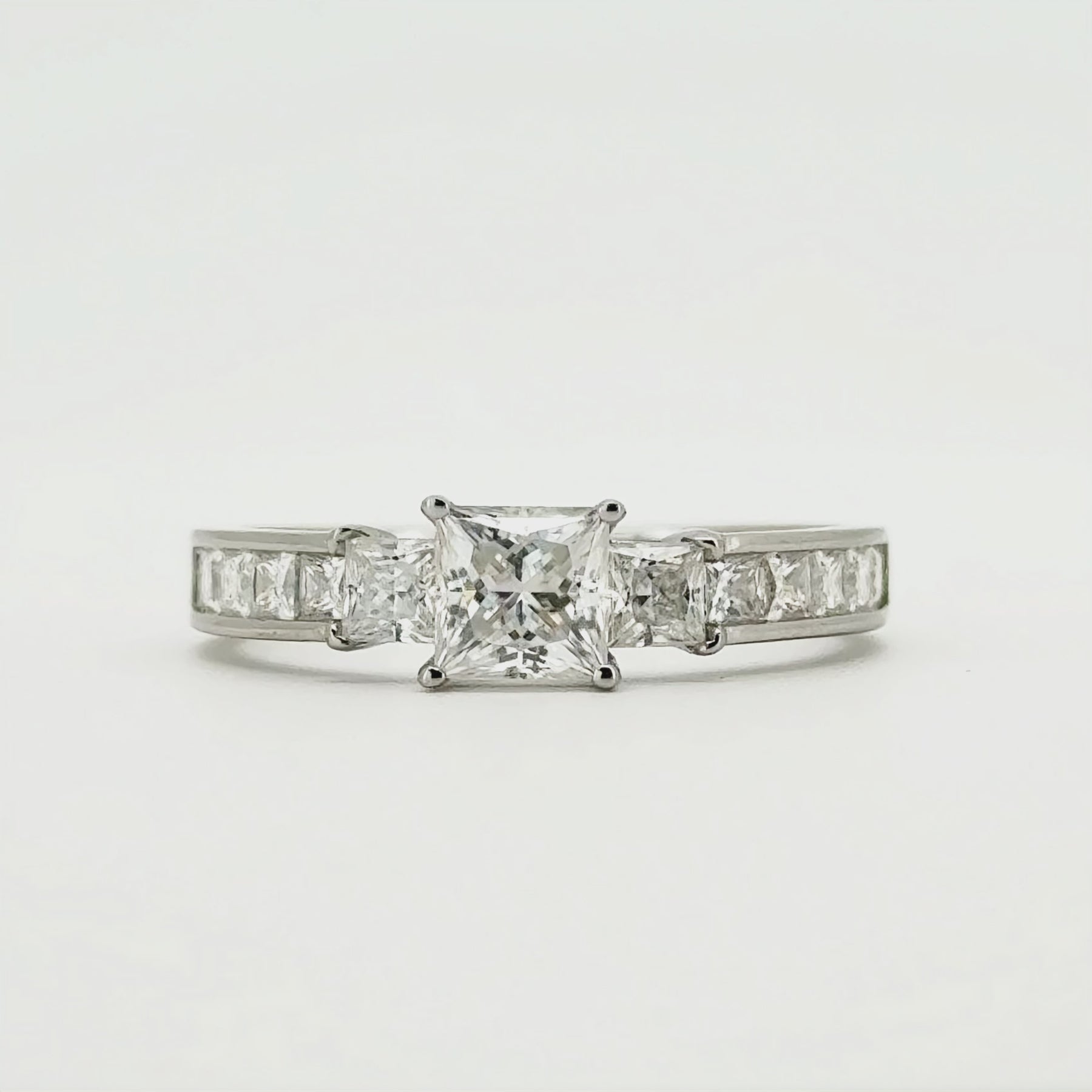 - Piedra Central: White Moissanite cuadrada 5×5 mm — 0.8 ct (1 pieza)