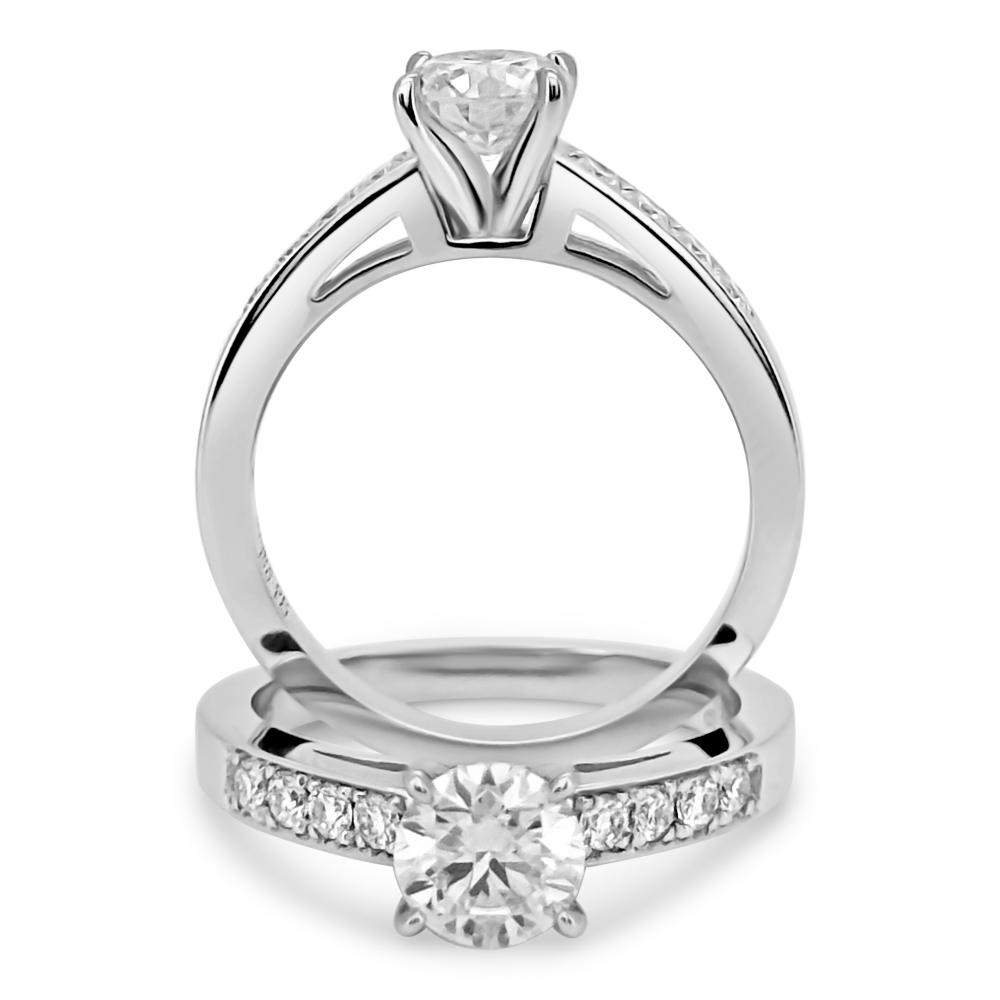 - Piedras Laterales: Moissanitas VVS1 D EX de 2 mm, engastadas en canal
