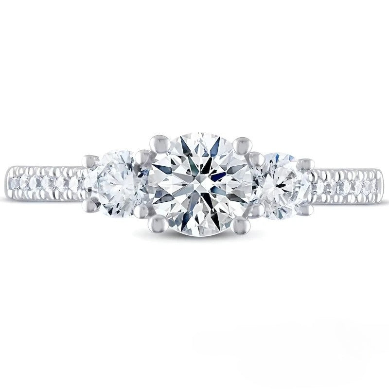 - Piedras Laterales: Dos moissanitas de 0.4 quilates cada una, engastadas delicadamente para complementar la piedra central