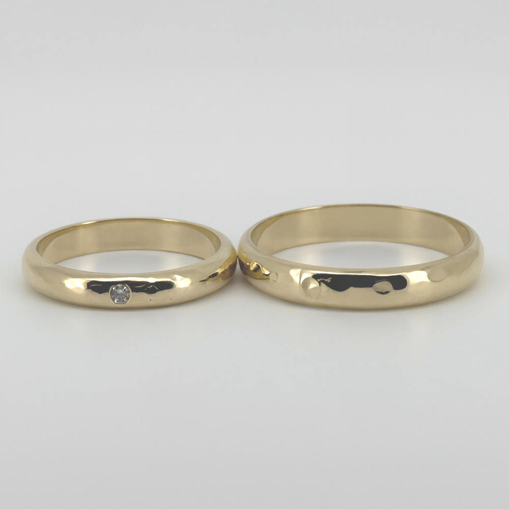 Par de argollas de matrimonio estilo martillado en oro 18k, la de ella es de 3mm y la de el 3.5mm , pesando ambos 8 grs aprox. Con un punto de luz de moissanita.